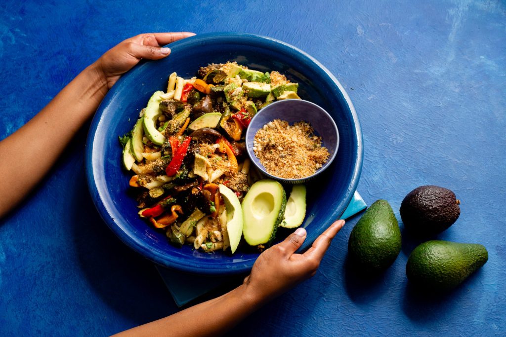 - To serve, peel, stone and dice the avocados. Toss the drained pasta with the roasted veggies and avocado. Arrange on a platter and sprinkle over the toasted crumbs, and garnish with fresh parsley.