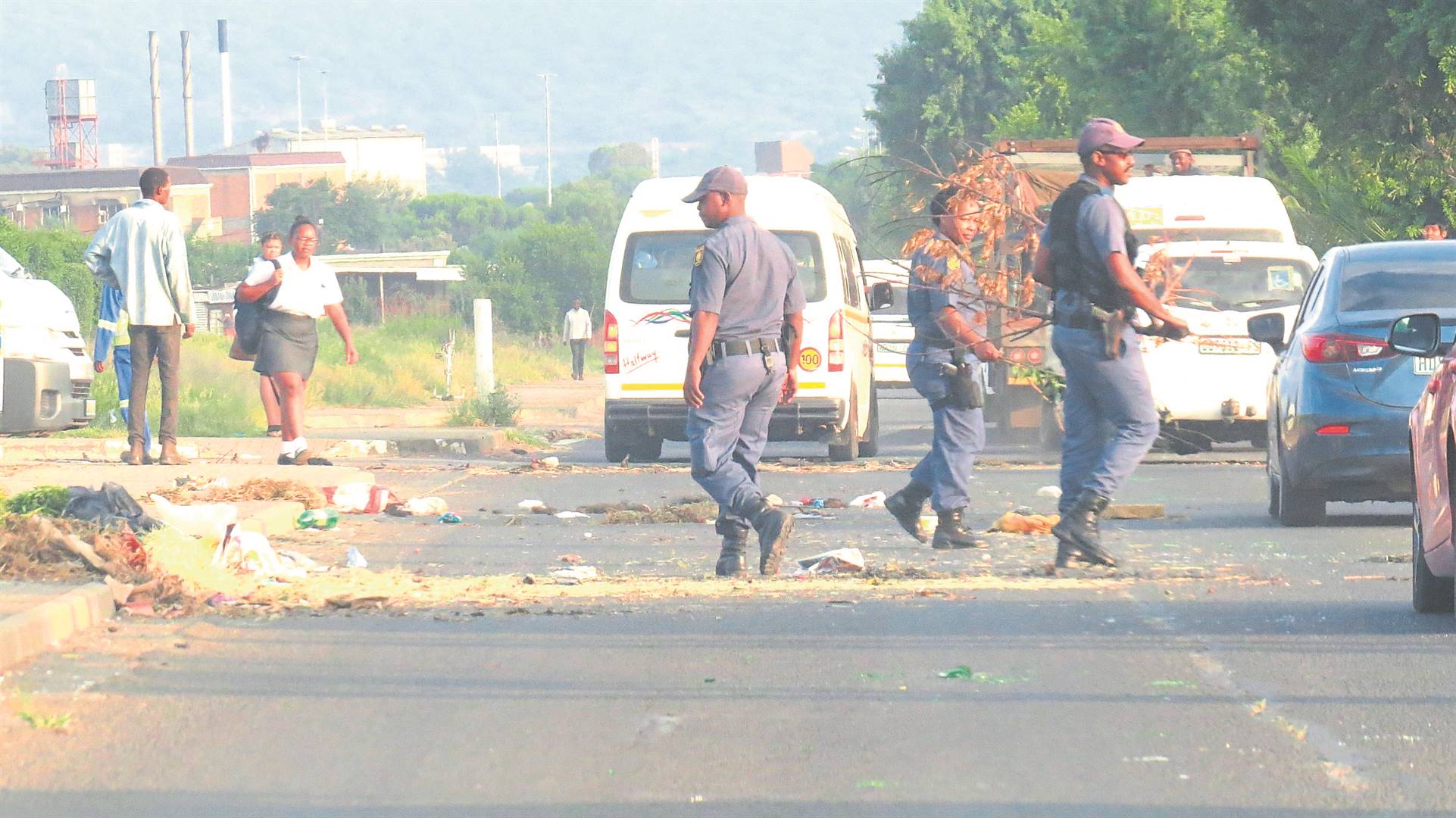 Members of the Bloemfontein Public Order Police clearing debris, stones, tree branches, uncollected refuse and burning tyres after a group of angry residents barricaded a section of Dr Belcher Road in Bloemfontein. Traffic was temporarily disrupted during the protest action. However, it is unclear what sparked the riot act in the early morning on Monday, 12 February.Photo: Teboho Setena