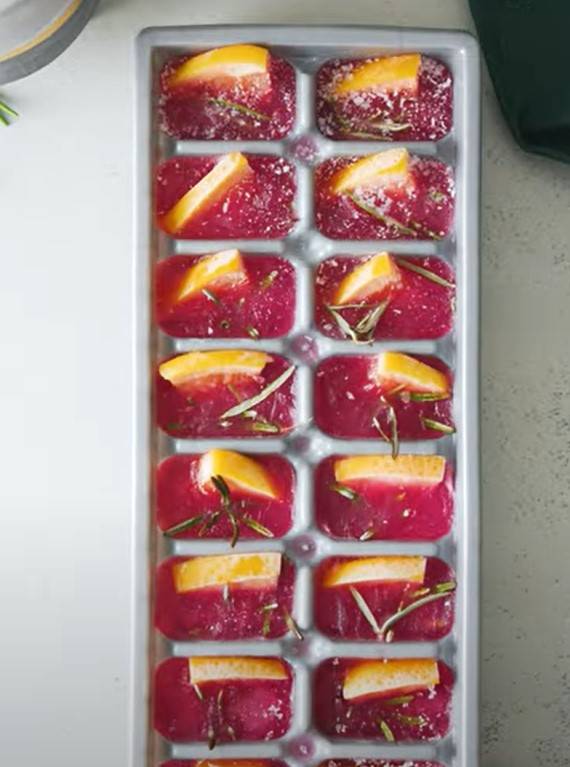 2. In a 14-hole ice-cube tray, add the fruit of choice to each ice-cube hole along with any fresh herbs.