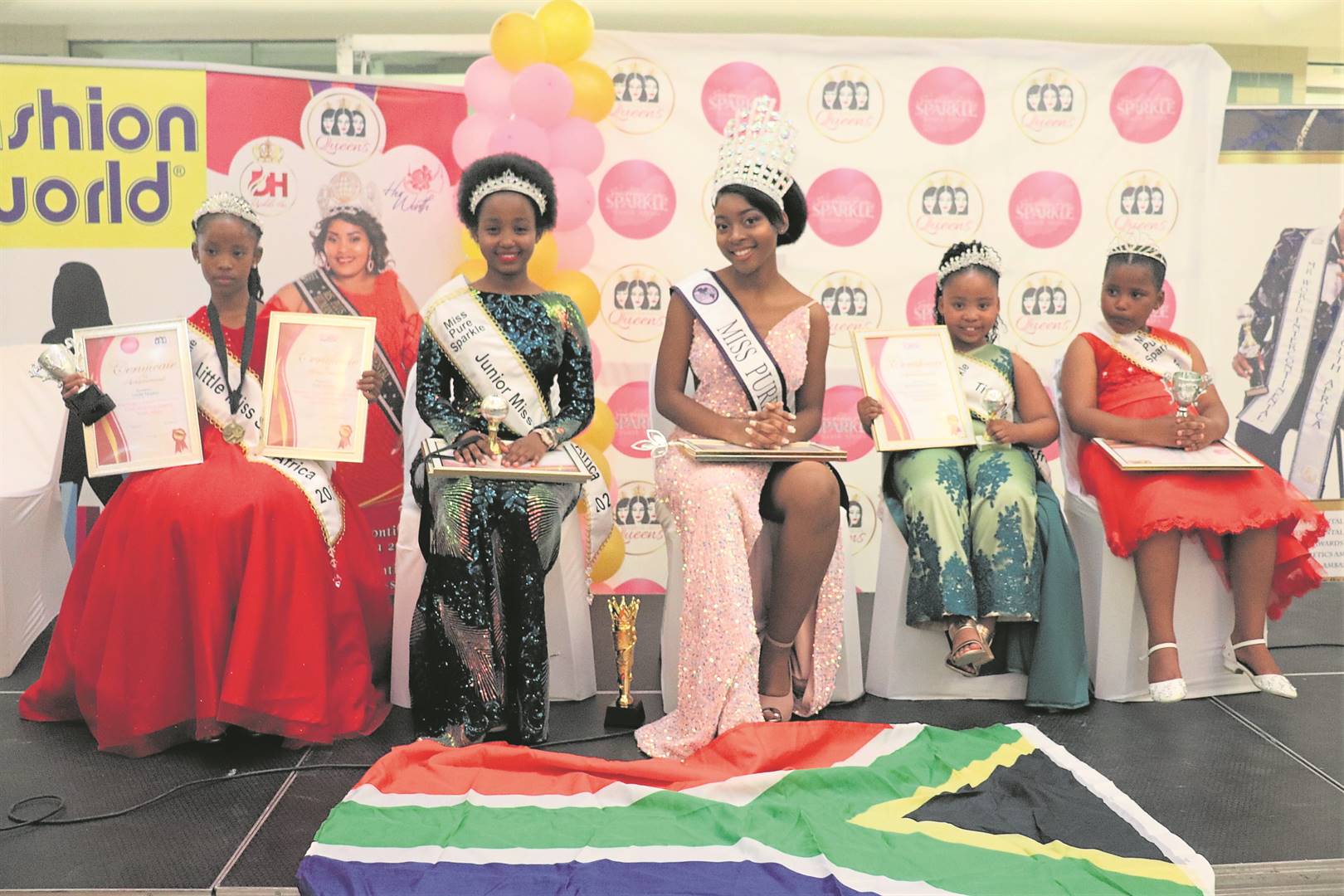 Five girls from Bloemfontein represented South Africa in the virtual Miss Pure Sparkle International pageant, and won in different categories. The winners are, from the left, Orefile Mojatau (Miss Personality in the Little Miss category), Mmonemang Mraushe (first princess and best interview in the Junior Miss category), Katleho Moeketsi (Miss Pure Sparkle queen), Tlhonolofatso Gaonwe (third runner-up in the Tiny Miss category) and Reitumetse Thakalekoala (top position in the Mini Miss category). The crowning ceremony was held on Saturday (19/11).Photo: Supplied
