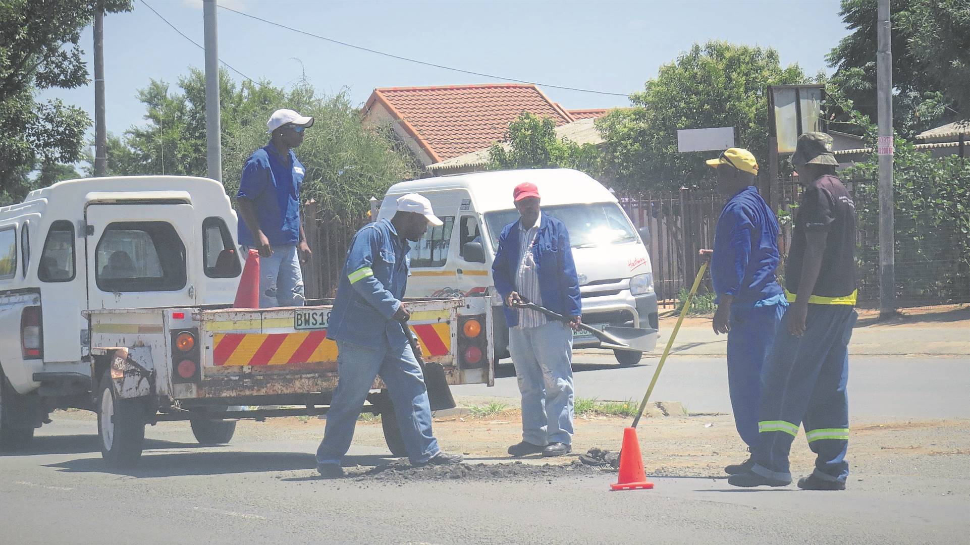 Workers, presumably employees of the Mangaung Metro Municipality, filling up one of the numerous potholes in Dr Belcher Road, Bloemfontein, with coarse gravel. Previous efforts have proven that holes filled in this way tend to erode shortly after due to traffic and rainfall. The filling of potholes is part of the government’s Vala Zonke initiative. This photo was taken on 4 February. Photo: Teboho Setena