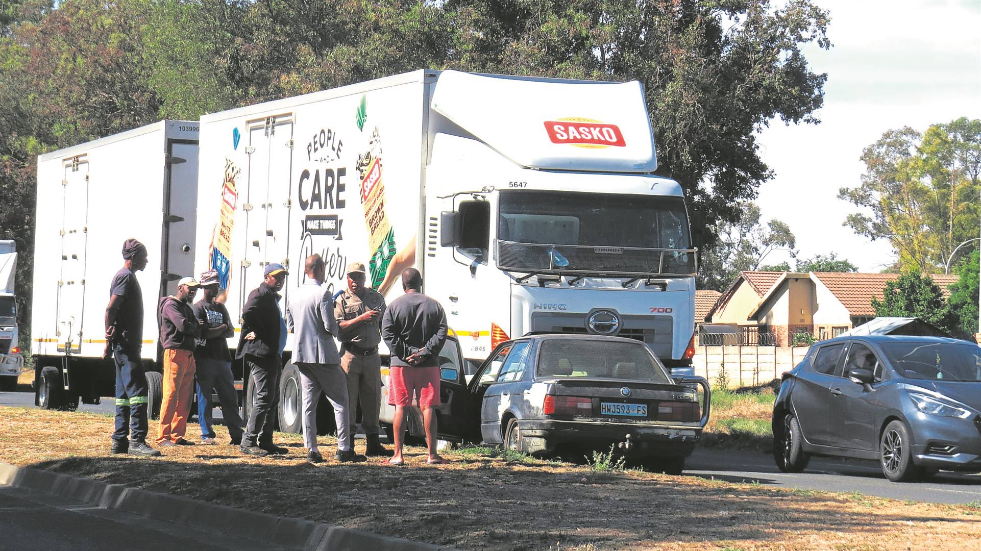 What was suspected of being a robbery in the morning of Thursday, 7 November, on O.R. Tambo Road in Bloemfontein, was in fact an accident involving a BMW 3-Series 325is, of which the driver miraculously survived unharmed. The sedan collided head-on with a Sasko truck. According to eyewitness reports, the driver of the BMW lost control of the vehicle, which ran over a traffic island, crashing head-on with the truck. The truck was heading north, and the BMW sedan, popularly known as a “Gusheshe” across townships, was going south. Traffic was temporarily disrupted due to the accident. Photo: Teboho Setena