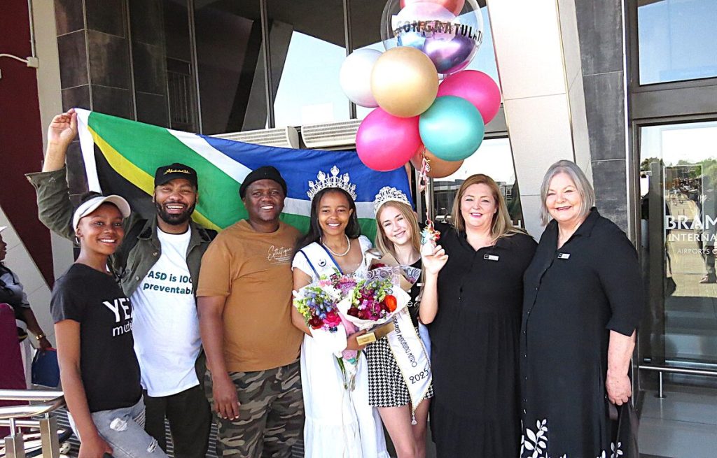 Nadia Mqonqo (fourth from left) receives a warm welcome at the Bram Fischer International Airport upon her return from Paraguay, where she won the 2025 Miss Teen Continental crown. From left are Simone Roules, Theo King, Mpumelelo Latyeba, Lieka Terblanche, Lize and Cecilia Voster. See photos on bloem-express.co.za. Photos: Teboho Setena