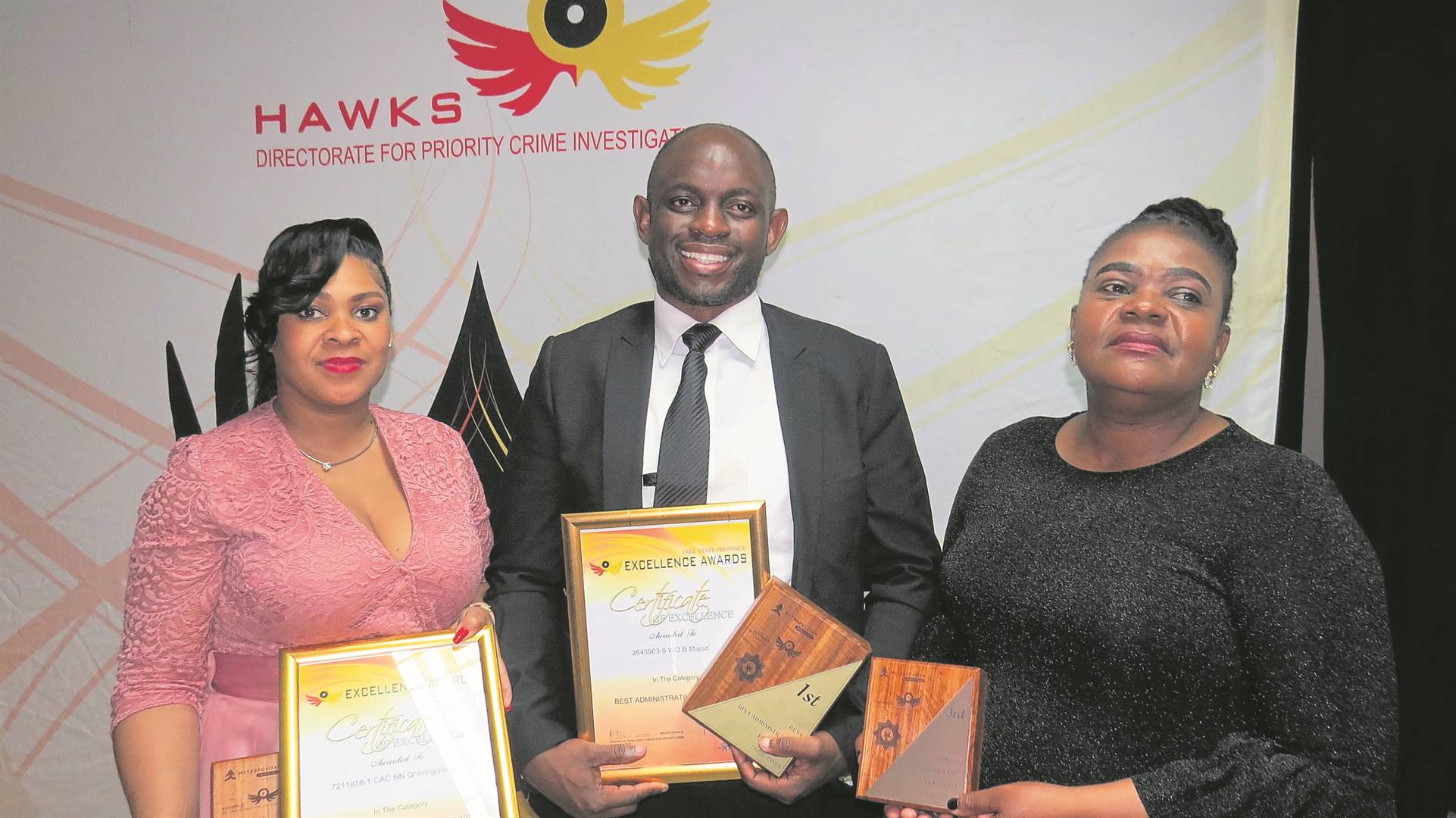 The administrative and auxiliary personnel of the Free State’s Directorate for Priority Crime Investigation (DPCI), better known as the Hawks, received certificates of excellence at an event in the Leslie Monnanyane Hall in Bloemfontein on 8 September. The aim was to recognise their dedication in ensuring the organisation thrives in its tireless pursuit of combatting crime. Some of the top administrative personnel honoured at the function are, from the left, Noxolo Qhimngoshe, Bongani Majozi and Maria Mokoena.Photos: Teboho Setena