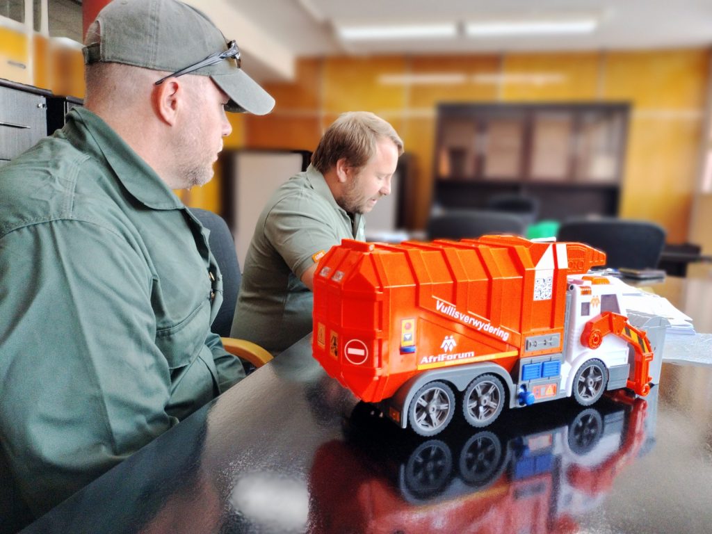 Christo Groenewald (links) en Jaco Grobbelaar van AfriForum het op Donderdag 4 September ‘n speelgoed-vullisverwyderingsvragmotor aan die hoof van afvalbestuur in die Mangaung-metro, Ernest Thabang, oorhandig om aan die stadsbestuurder, Sello More, te gee. Foto: Lientjie Mentz