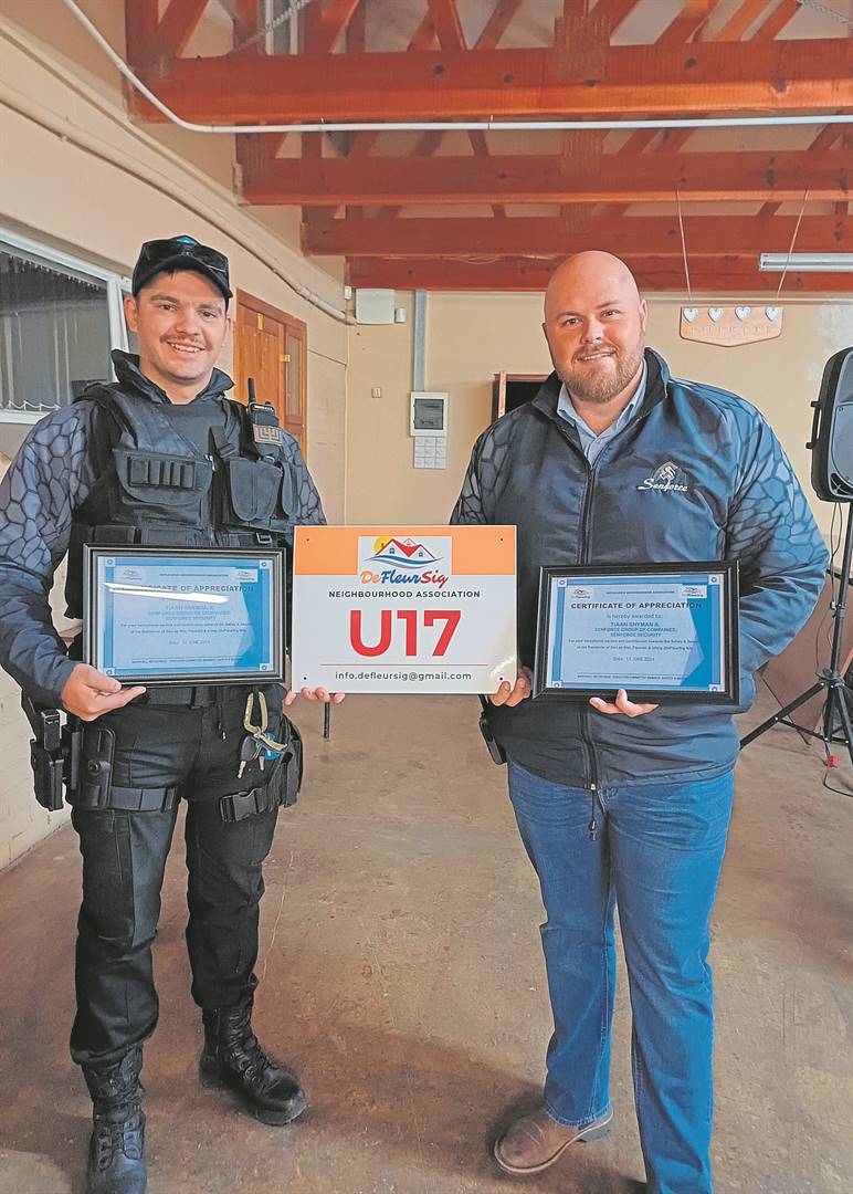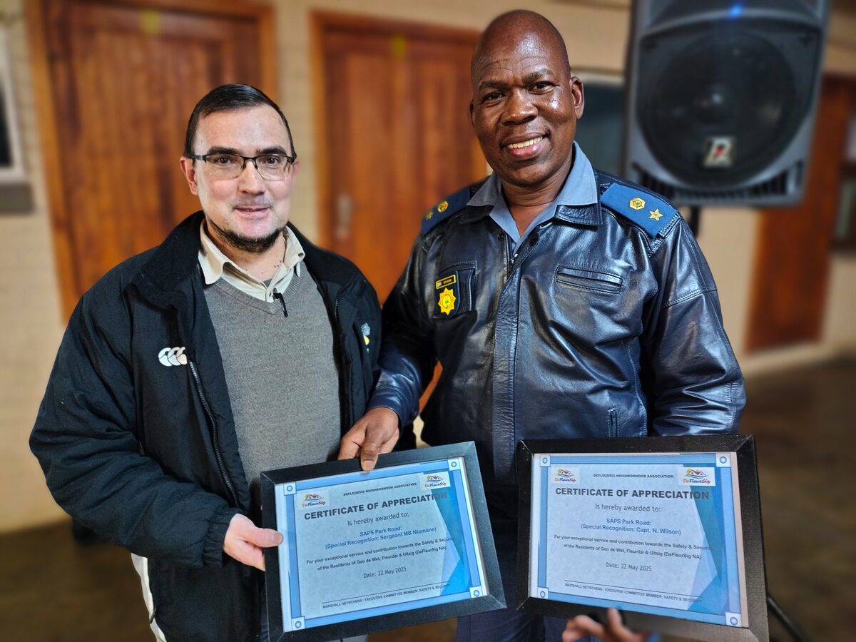DeFleurSig Neighbourhood Association gave out a token of thanks to members of the SAPS. Here with awards to srg Matete Ntomane en capt Nico Wilson that could not attend the event, are from the left Marshall Neyschyens (DeFleurSig) and lt.col. Eseu Mphirime. Photo: Lientjie Mentz