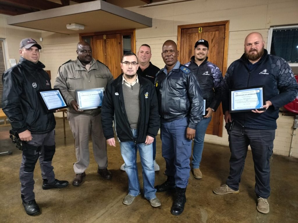 Tokens of appreciation were handed out to security members that are active in Fleurdal, Uitsig, and Genl. de Wet. They are, from the left, Rikus Slabbert of Bloemsec, Sylvester Mohyokare (Fedility ADT), Marshall Neyhchyens (DeFleurSig), Johan Maritz (SecuriForce), Lt. Col Eseu Mphirime, Tiaan Snyman, and Jeandré Swarts (of Senforce). Photo: Lientjie Mentz