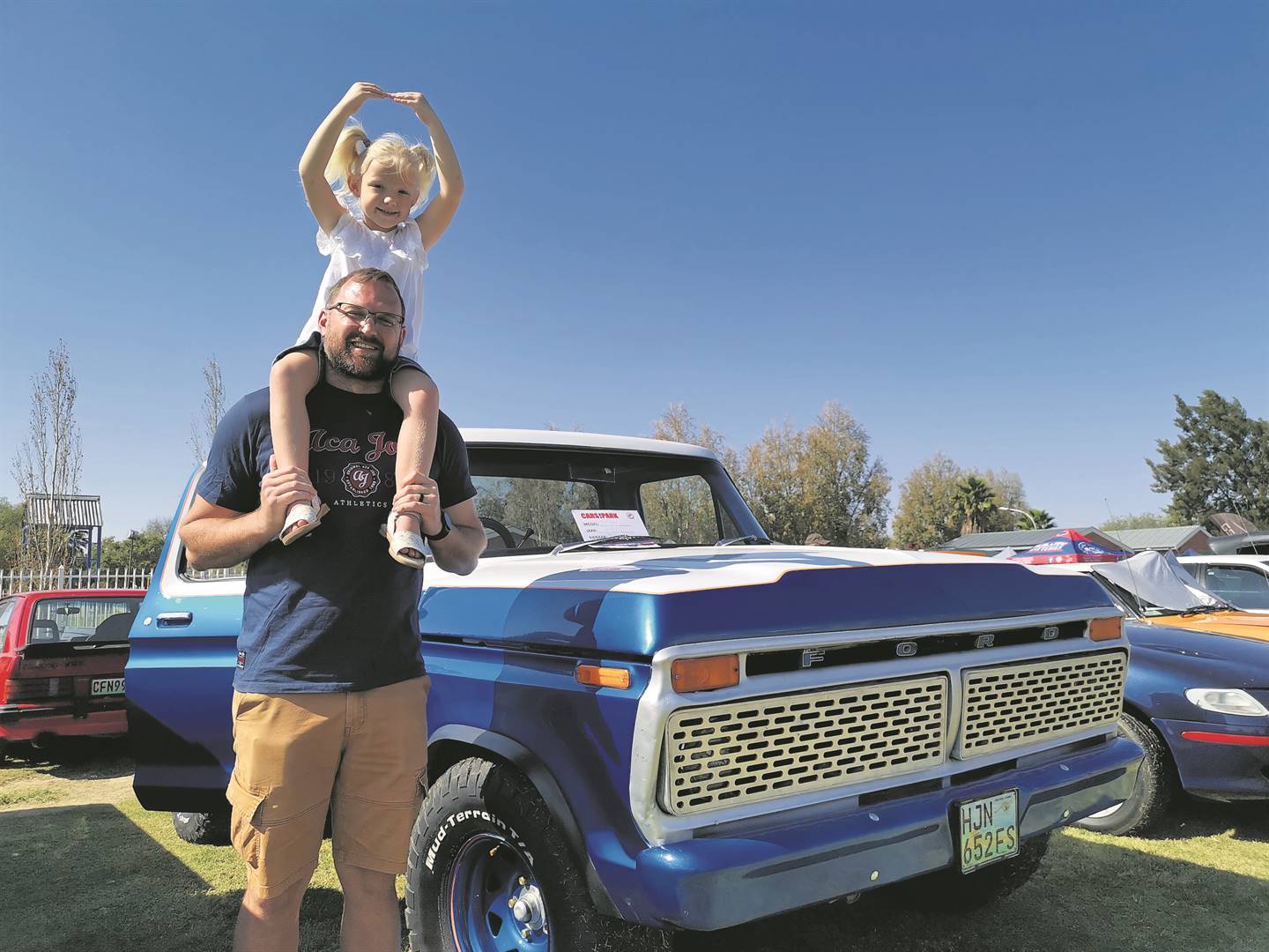 Die jaarlikse Cars in the Park-motorskou in Bloemfontein, waarop veral klassieke motors vertoon word, het op 1 Mei van motorgeesdriftiges én nuuskieriges by die Martie du Plessis-skool gewemel. Hier is Leah Strydom (4) en haar pa, Reinhardt, by haar gunsteling-voertuig op die skou – ’n 1976-Ford F100-bakkie. Foto: Marita Herselman