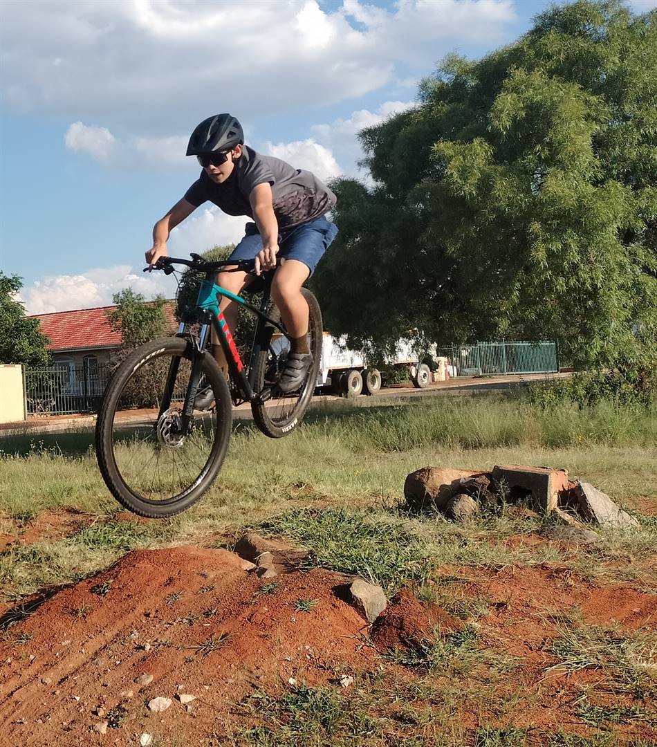 Jan-Pierre Laubscher voer ’n sprong uit danksy die baan wat hulle die afgelope vakansie in die parkie gebou het.Foto: Lientjie Mentz