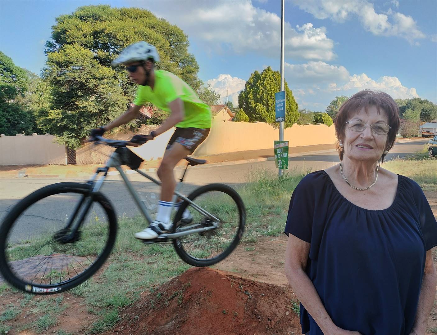 Henco Thompson ry op die baan verby Marie Coetzer, ’n inwoner wat naby die parkie woon. Sy het hulle bygestaan en ondersteun terwyl hulle tydens die Desember-vakansie ’n fietsrybaan gebou het.Foto: Lientjie Mentz
