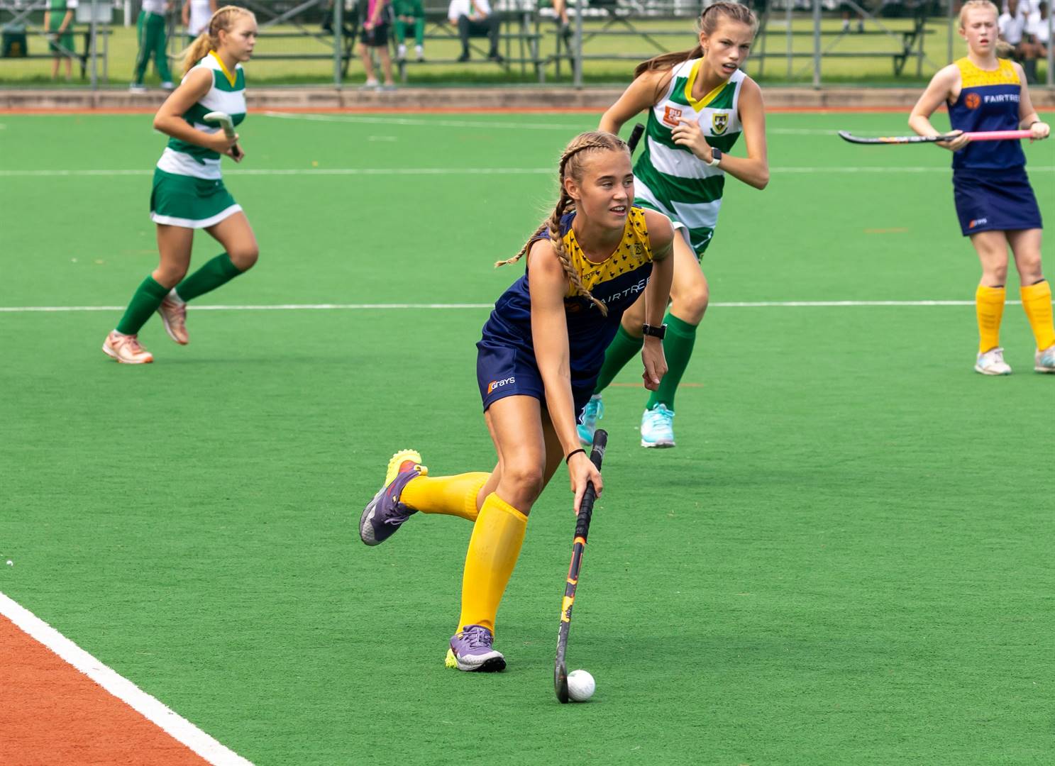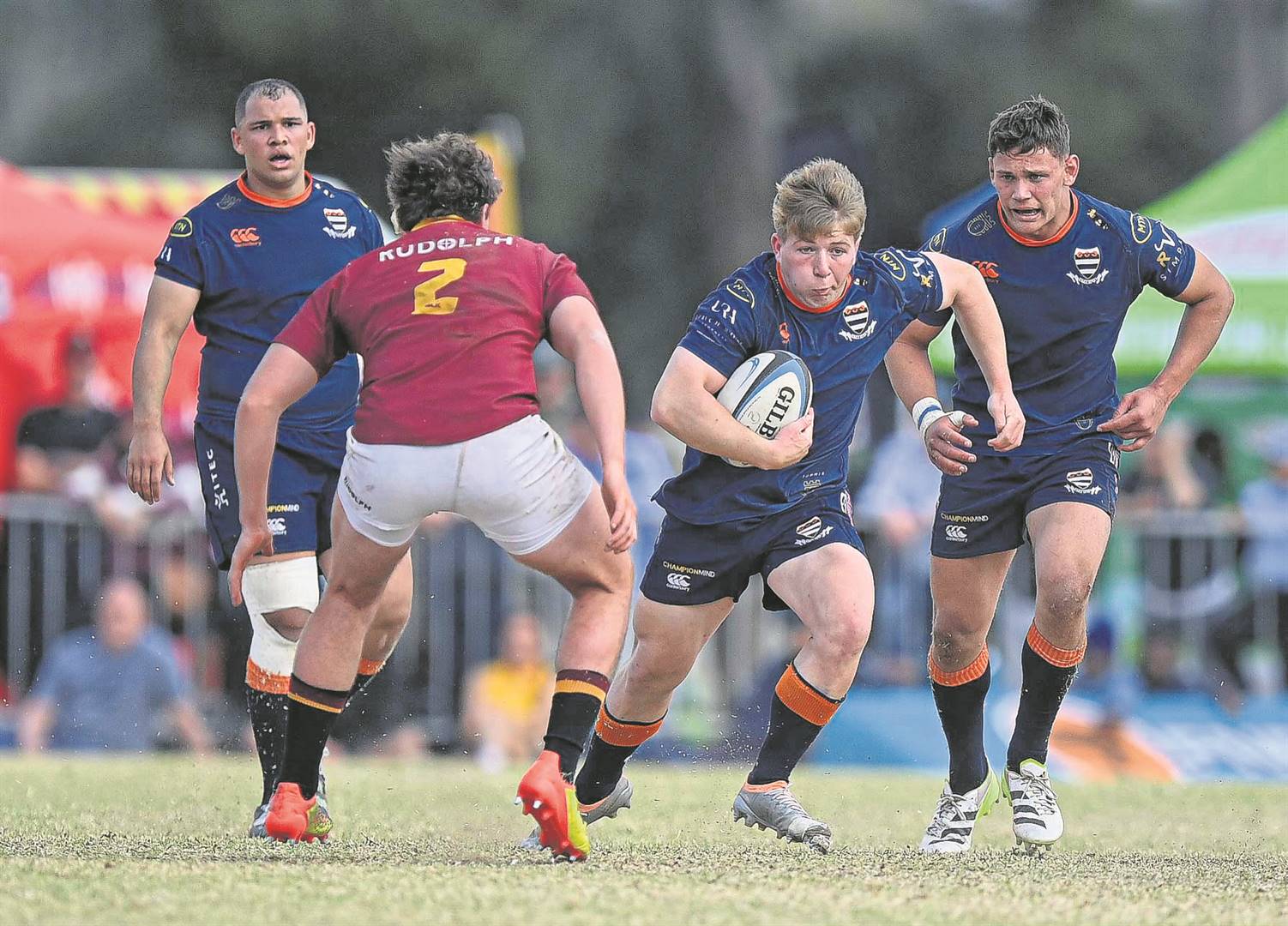 Emile McGeer, Grey-kollege (sekondêr) se stut, hardloop hier met die bal in Saterdag (19/08) se interskole-wedstryd teen Paul Roos Gimnasium. Grey het die wedstryd met 28 – 20 gewen en daarmee die jaar onoorwonne afgesluit. Die span het altesaam 16 oorwinnings op die veld behaal.Foto: Mlungisi Louw