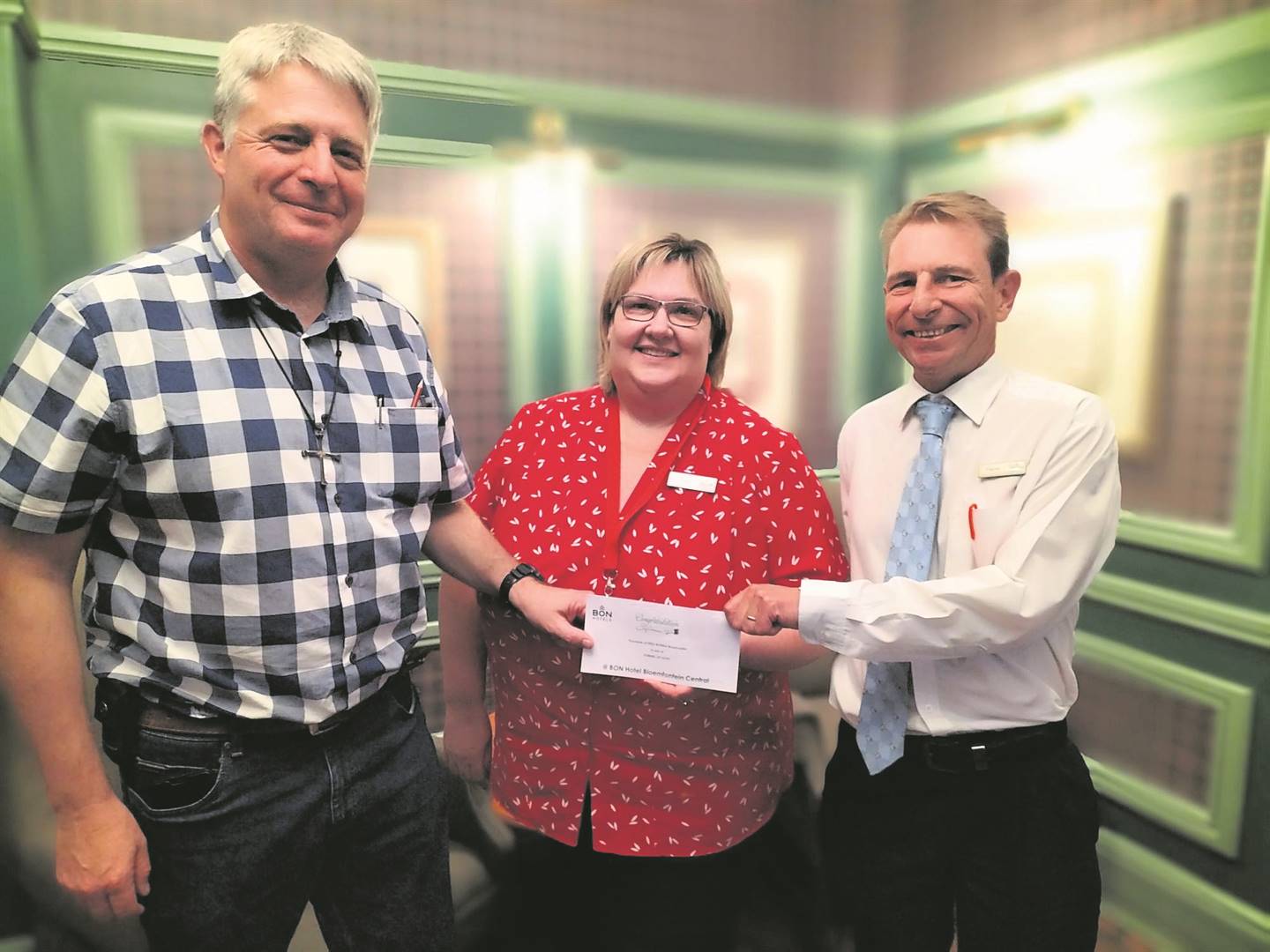 Die Bon-hotel Bloemfontein het op 27 Oktober ’n skenking van R16 800 aan Torings van Hoop gedoen. Ten tyde van die oorhandiging is van links ds. De la Harpe le Roux (Torings van Hoop), Tersia Miranda (finansiële bestuurder van die Bon-hotel) en Pieter van Rooyen (bestuurder van die Bon-hotel).Foto: Lientjie Mentz