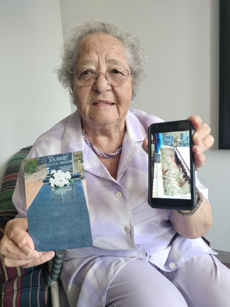 “In 2021 moes ons die kopstuk weer vas sit nadat die marmer waarop dit gestaan het, afgesteel is,” sê sy oor haar man, wyle Gawie Joubert wat in 2017 oorlede is, se graf.