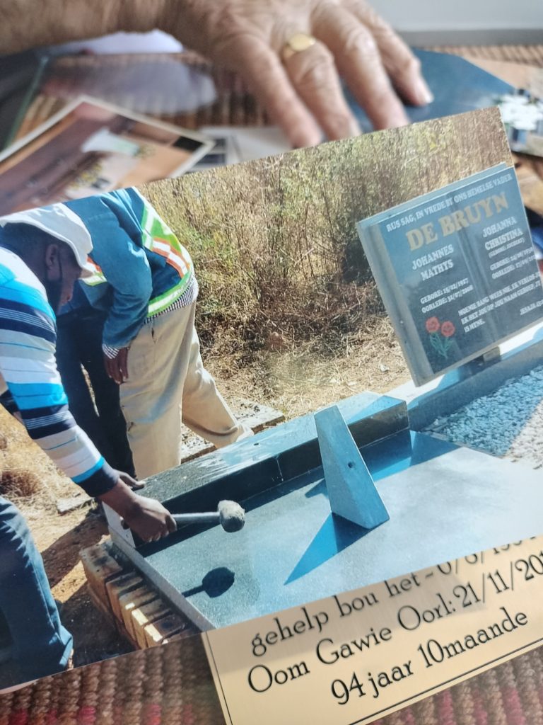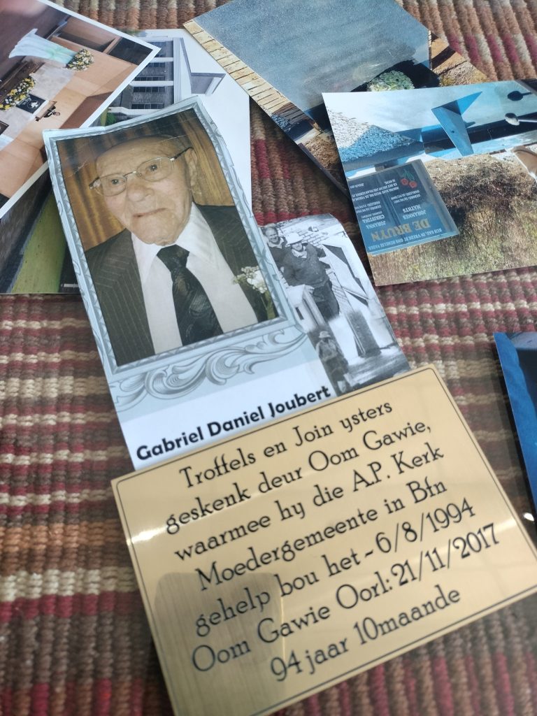 Tannie Susan sy was 54 jaar oud toe sy met oom Gawie getrou het. “Toe ons jonk was, het ek vir hom gesê hy gaan nog horingoud word en ek gaan nog met hom trou. Hy het drie vroue oorleef voordat ek met hom getrou het toe hy 72 was,” vertel sy oor haar man. Sy sê hy het gehelp met die bou van die A.P. Kerk Moedergemeente in Bloemfontein. “Ek wil graag sy gedagtenis eer.”