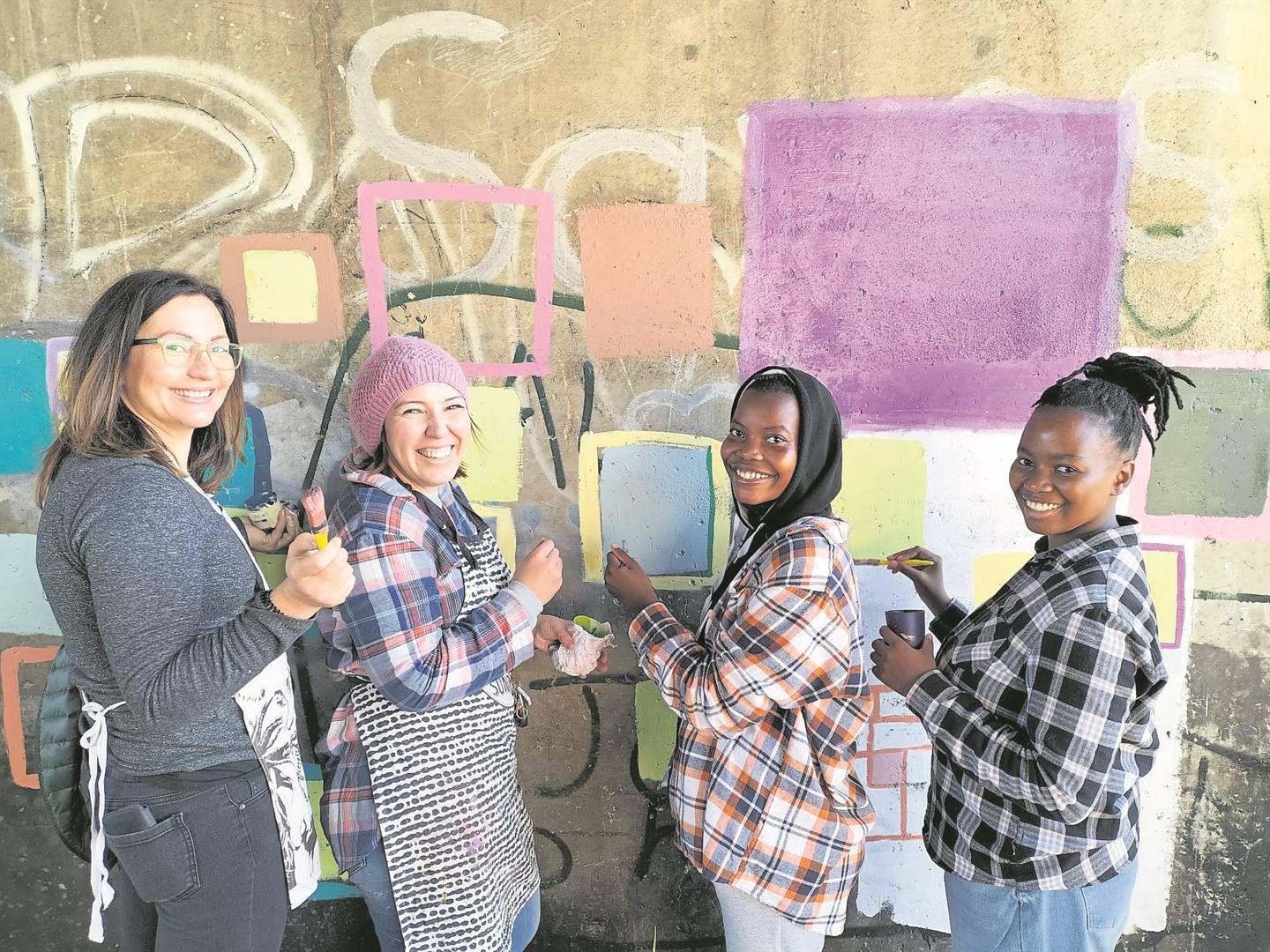 Die brug onder Benaderylaan in Montgomerystraat is Saterdag 4 Junie verder versier. Hier is van links Lisa Nel van die Sentrale Universiteit vir Tegnologie (SUT) se departement ontwerp en ateljeekuns, Liesel Wessels (organiseerder van die projek) en twee SUT-studente, Ilitha Taliwe en Simoshihle Mrwetyana.Foto: Lientjie Mentz