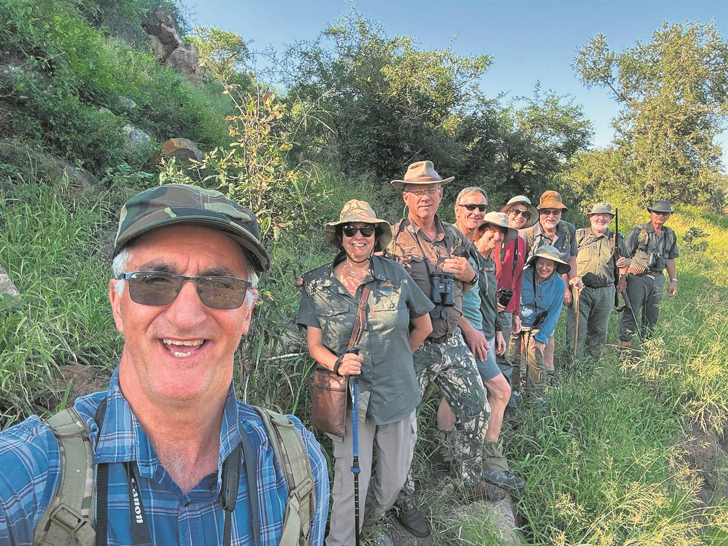 Op ’n oggendstaptog in die hartjie van die Krugerwildtuin is van links Pieter Burger, Anelle Schoeman, Theo Schoeman, Willie Endres, Sonja Endres, Edell Burger, Chrissie Malan en Wynand Malan, saam met die veldgidse Johann Botha en Willie de Beer. Foto: Verskaf