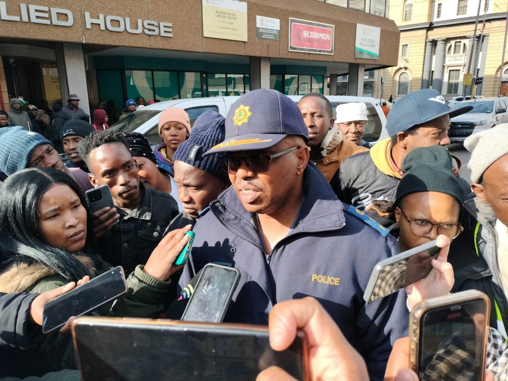 Brig. Motantsi Makhele spreek die media toe nadat ‘n senior amptenaar van die departement arbeid Donderdag 3 Julie in Bloemfontein se middestad in hegtenis geneem is. Ftoto’s Lientjie Mentz