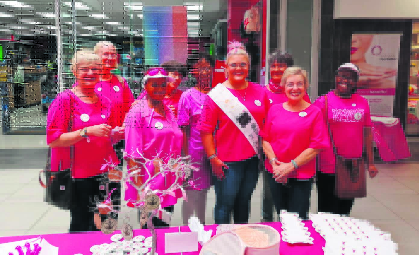 Die Vrywilligers van Reik na Herstel het op 14 Oktober ’n borskanker-bewusmakingsoggend in Northridge Mall gehou. Van links is Ilse de Witt, Klazina Hattingh, Constence Mere, Mathilda Henning, Brigetta Louw, Tanya Pike, Esmé Pol, Rene Barnard en Evodia Molomo. Foto: Verskaf