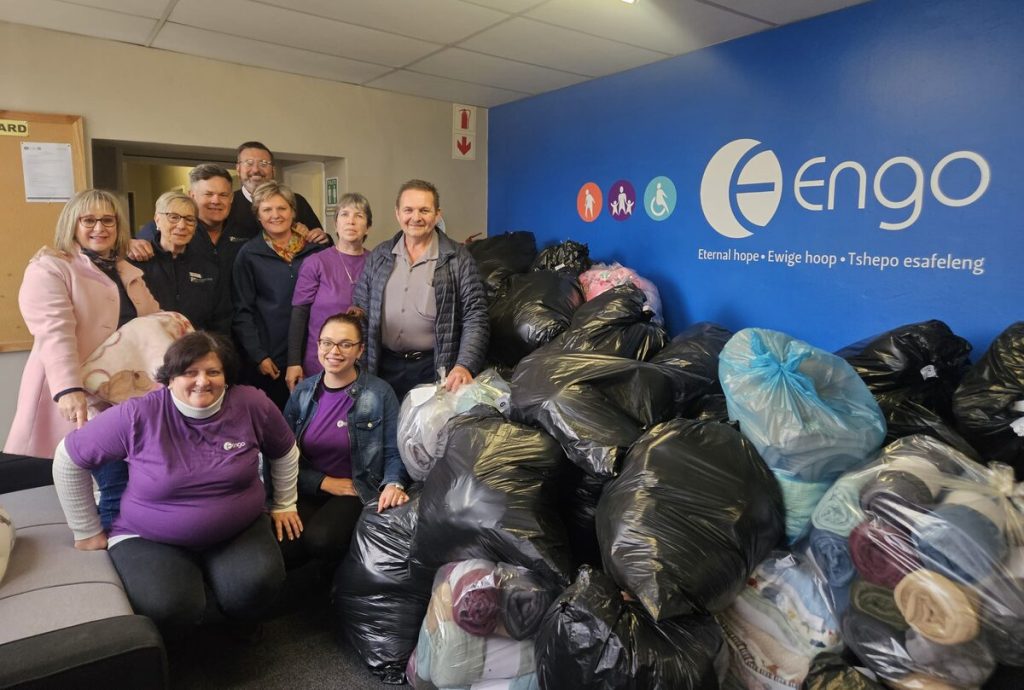 St Andrew’s School Bloemfontein aan Radio Rosestad se Warm Winterkombers-projek geskenk het, het die span van Rosestad die komberse aan Engo oorhandig.