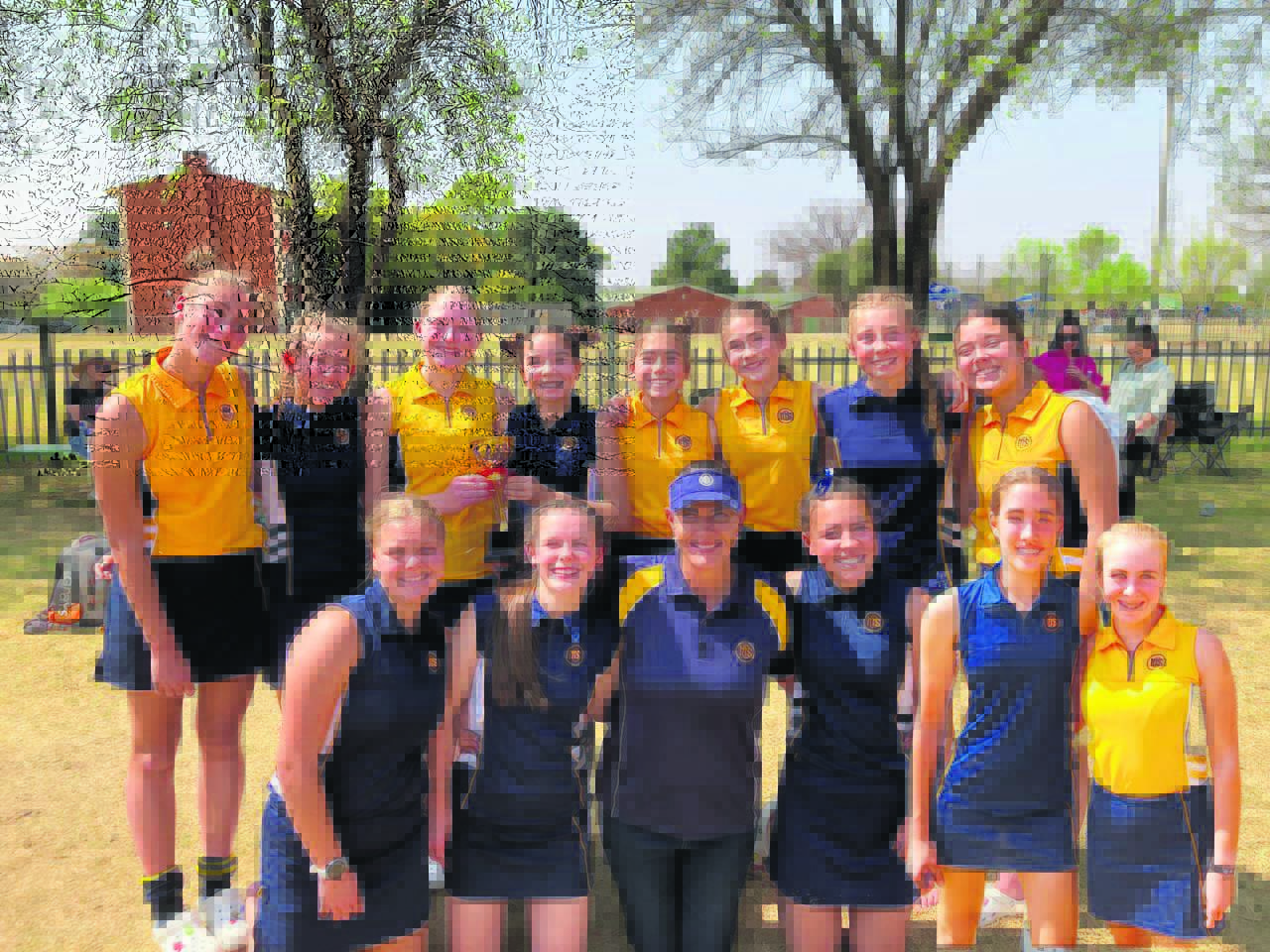 Die Hoër Meisieskool Oranje se o.14-hokkiespanne het op 9 September hul afdeling in die Hoërskool Jim Fouché se vyf-aan-’n-kant-hokkietoernooi by Jim Fouché gewen. Oranje se Geel- en Blouspan was albei onoorwonne, behalwe toe Geel vir Blou geklop het. Van links is, voor: Janette Jordaan, Nieke Grobler, Mariska van Staden (afrigter), Anneh Keyser, Dane Jansen van Vuuren (o.13) en Kyla Vosloo Credit: SYSTEM