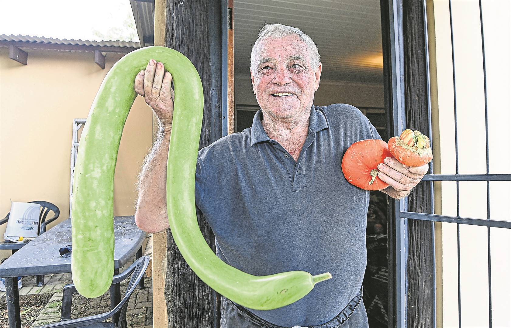 ’n Bloemfonteinse oupa straal van trots oor sy eiesoortige pampoene nadat hy die saad uit Duitsland in sy groentetonnel geplant en sien opskiet het.