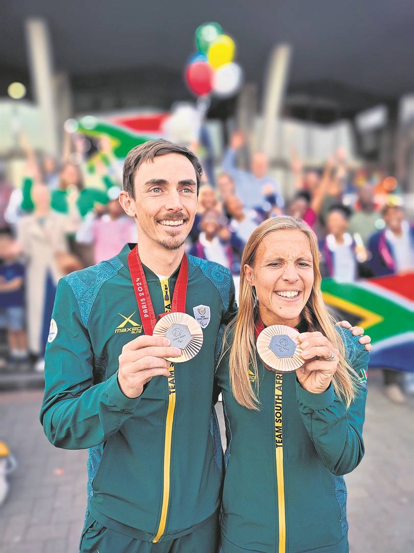 Louzanne Coetzee (regs) is op Dinsdag 10 September met ’n helde-ontvangs by die Bram Fischer-lughawe in Bloemfontein terugverwelkom van die Paralimpiese Spele wat in Parys, Frankryk, aangebied is. Sy en haar kortafstandgids, Estean Badenhorst (links), het op 2 September ’n bronsmedalje in die 1 500 m (T11-klas) verower, en sy het haar persoonlike beste tyd van 04:35.49 opgestel. Estean het vroeër teruggevlieg. Louzanne se man, Juandré Badenhorst, Estean se broer, asook studente van Huis Akasia en personeel van KovsieSport by die Universiteit van die Vrystaat (UV), vriende en die media het Louzanne en Claus Kempen, Louzanne se gids in die marathon, op die lughawe verwelkom. Louzanne en Claus het op Sondag 7 September aan die Paralimpiese marathon (T11/12) deelgeneem en ’n sewende plek in ’n tyd van 3:25:53 behaal. In die Paralimpiese Spele in Tokio in 2021 het Louzanne en Claus ’n wêreldrekord en Paralimpiese rekord in die T11-afdeling van die marathon (3:11:13) opgestel wat steeds staan.Foto: Lientjie Mentz