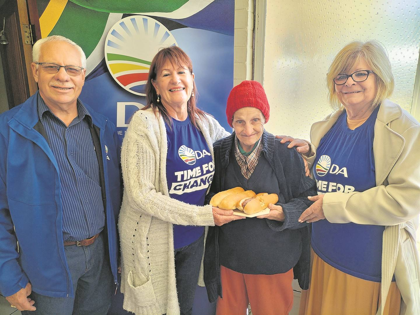 Die DA se wykskomitee in Universitas het Maandag die 40 inwoners van die Yade-huis in Sergeantstraat elk op ’n Erfenisdag-worsbroodjie trakteer. Van links is Hennie van Niekerk (wyksraadslid), Sylvia Burger (wykskomiteelid), Julia Watson (inowner van Yade) en Daphne Alison (vrywilliger).Foto: Lientjie Mentz