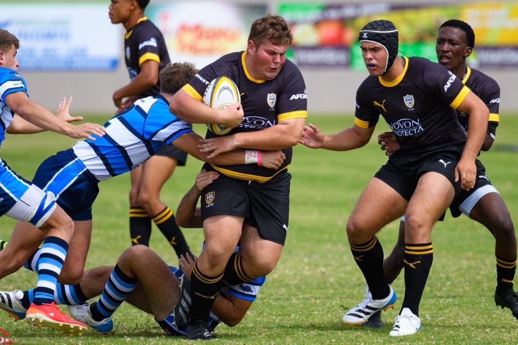 Willie Pretorius, stut van Bethlehem Voortrekker Hoërskool se eerste rugbyspan beur voort met die bal in die wedstryd teen die Hoërskool Fichardtpark. FOTO: Lethole Mokoena