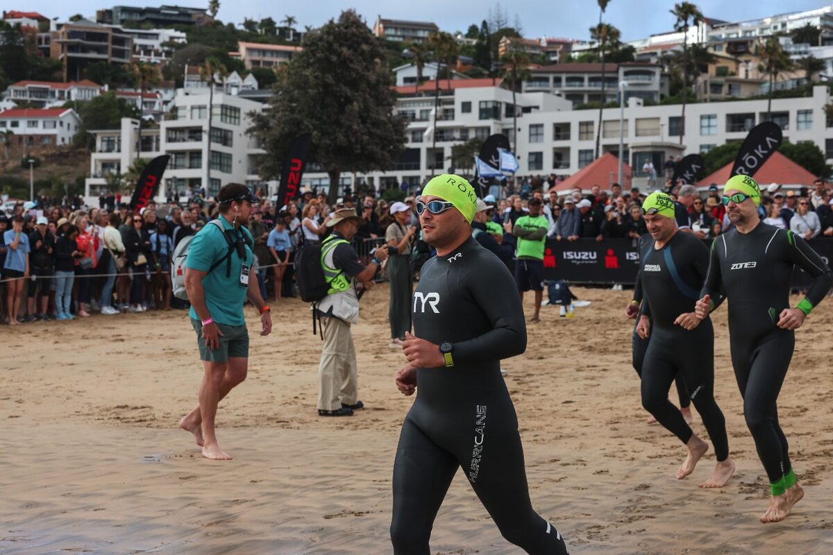Atlete hardloop see toe vir die swem-gedeelte, van Santos- strand tot by De Bakke.