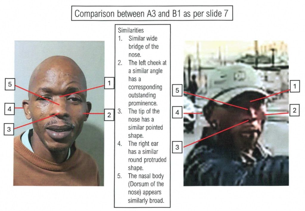 AO Nicolette Keyser, ‘n forensiese ontleder wat in gesigidentifikasie spesialiseer en by die Suid-Afrikaanse Polisiediens se Plaaslike Kriminele Rekordsentrum (LCRC) gestasioneer, het deur middel van morfologiese analise bevestig dat die beskuldigde die persoon is wat voor die broodvragmotor gestaan het, soos uitgebeeld op die stilfoto’s en kringtelevisie-materiaal.