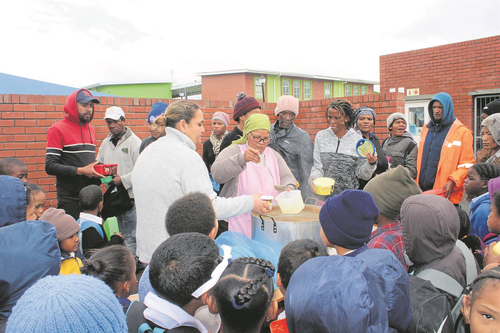 Vir haar 67 minute ter viering van Mandeladag (Donderdag 18 Julie), het die Erijaville-gemeenskap se moederhen met ’n omgeehart, Katy Arendse, kos aan behoeftige gemeenskapslede en kinders uitgedeel. Arendse het danksy die hulp van gewaardeerde skenkings die potte aan die prut gehad met sop wat sy in ruim porsies op die koue wintersdag by Rusthof Primêre Skool (soos bo gesien op die foto) en later by haar tuiste, aan tientalle honger magies uitgedeel het. Foto: Yaseen Gaffar