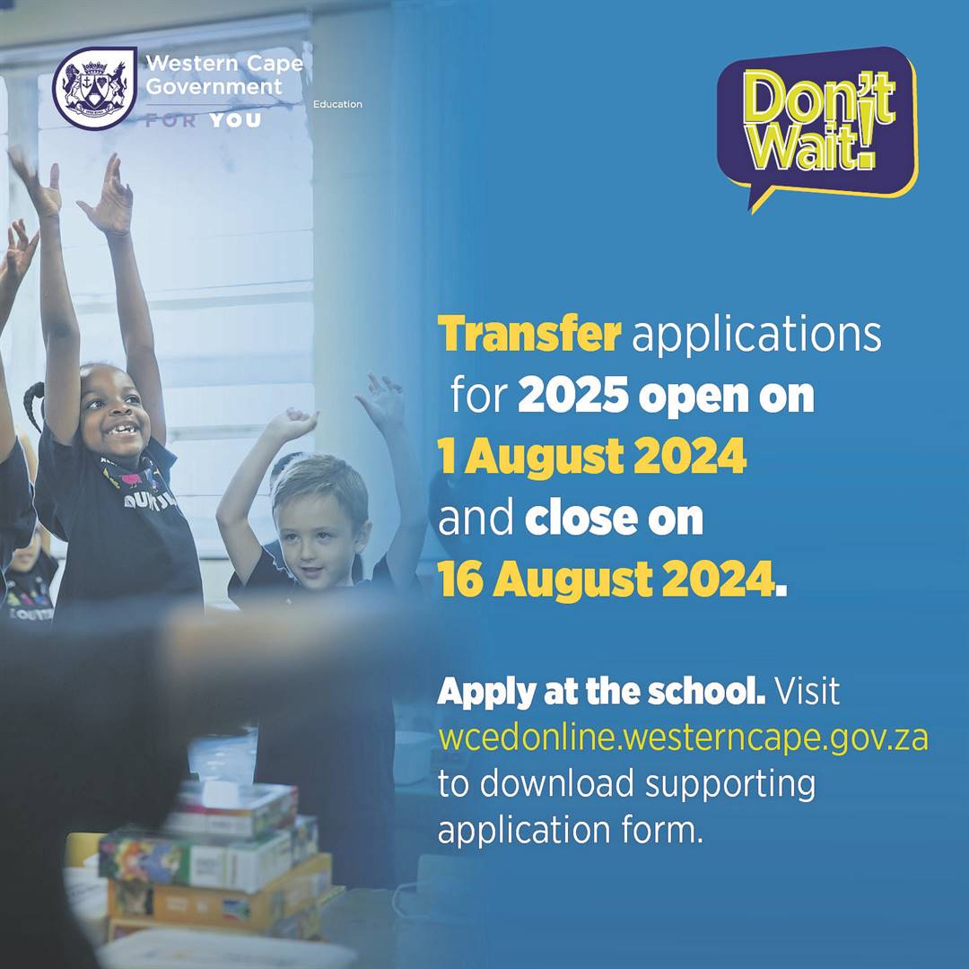 Parents who wish to apply for Grade R or a school transfer for the 2025 school year can do so from Thursday 1 until Friday 16 August.