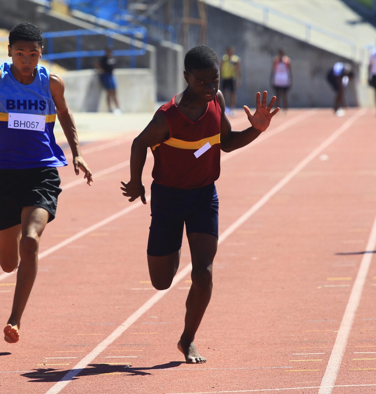 Silent Garaiza of Zandvliet High School gives his all as he crosses the line ahead of the pack during the 100 m heats for under-14 boys at Vygieskraal on Saturday.