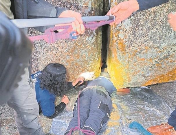 In a detailed account, Chadwick recalled Eva being located within a tight shaft of a big boulder, which had “split asunder eons ago by a vertical crack”, a short 20 m scramble off a high, seldom-used mountain trail. “The missing dog was some 6 m along the fissure, completely trapped, jammed head first, on its back, with its rear legs just visible,” he said. “Even a small person would not be able to reach the dog, so we put together our equipment and made a plan. A safety rope was put around the waist and ankles of the volunteer who would enter part way along the tight cleft, so we would be able to extract her.”
