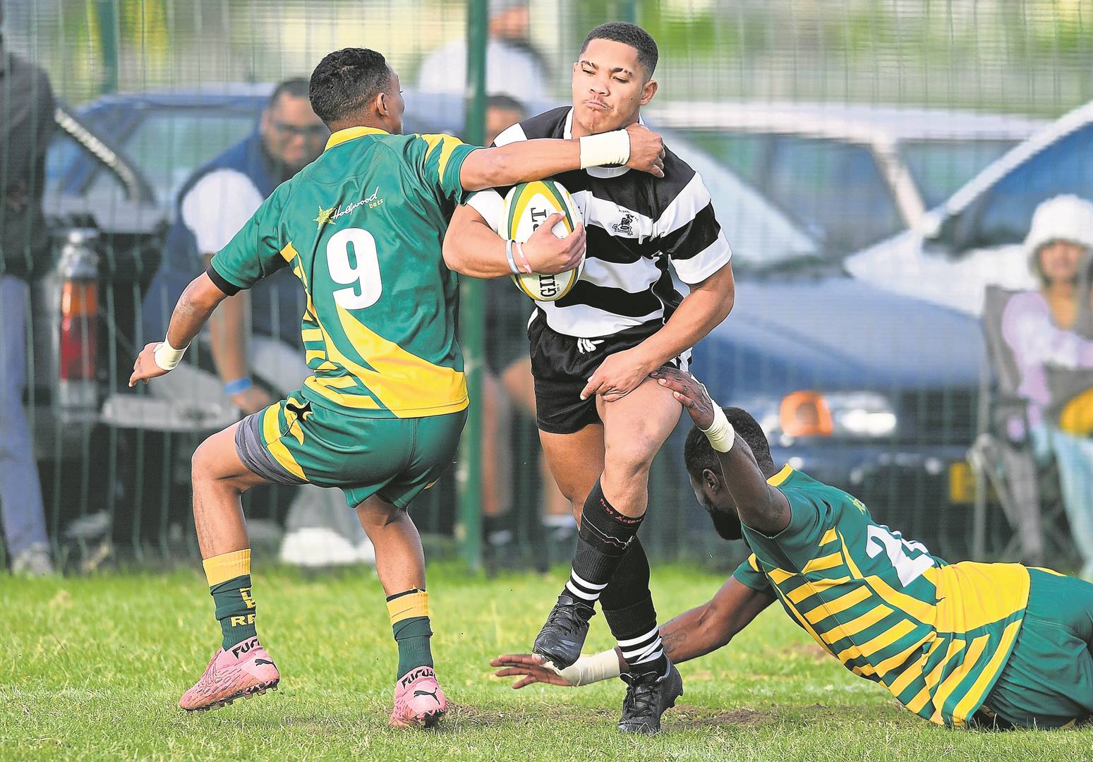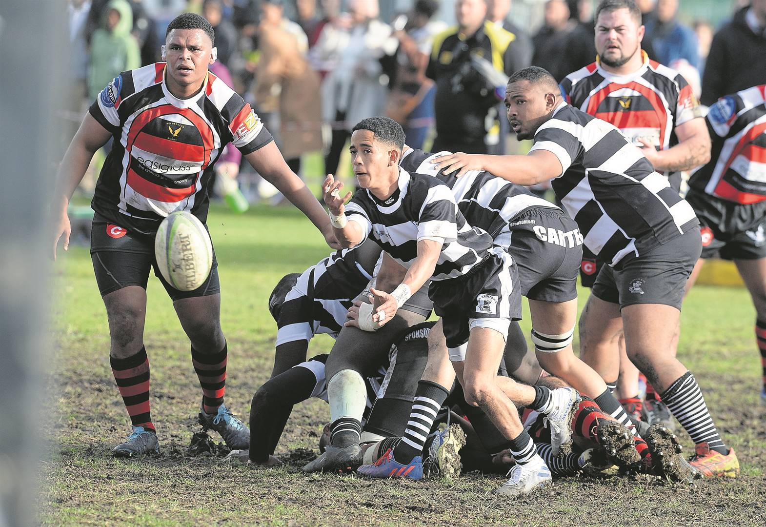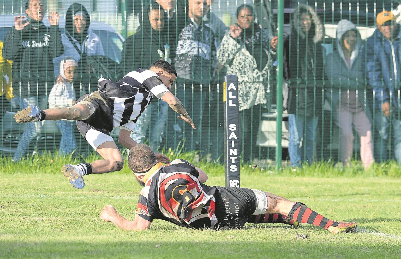 Die veteraan-senter Cheslin Jack het All Saints se rekening in die 22ste minuut met ’n 30-meter strafdoel geopen (3-0). Die puik flank van Helderberg, Schalk Burger, het in die 35ste minuut – ná vele aanvalsaanslae op Saints se lyn – oor die lyn gebeur. Die skrumskakel, Marshall Douman, het verdoel (3-7).