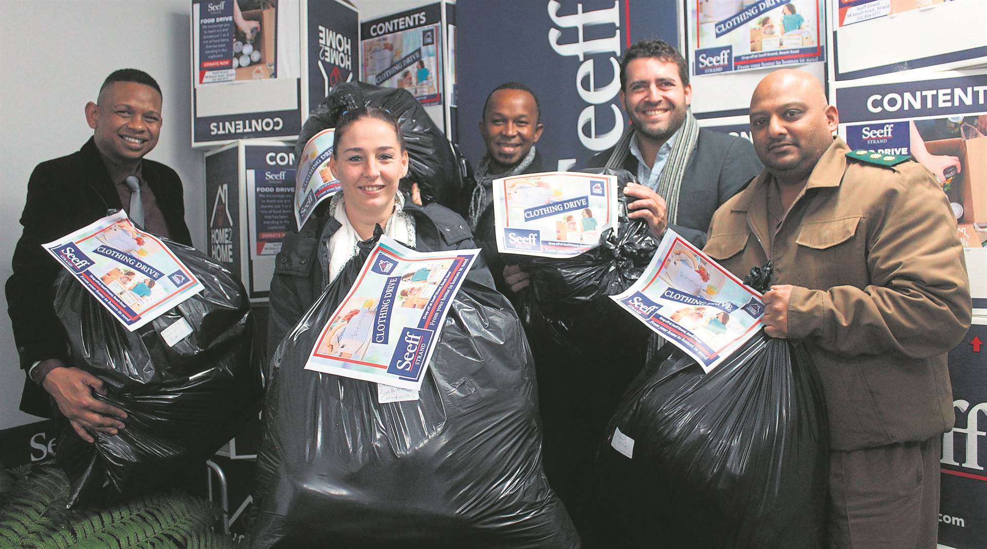 ’n Plaaslike eiendomsagentskap en omgee-mense uit die Helderberg het saamgespan vir skenkings om twee gesinne te help nadat hulle hul Ruthof- wonings op Vrydag 26 Mei in ’n verwoestende brand verloor het (“Twee gesinne verloor alles in brand,” DistriksPos & Helderberg Gazette, 31 Mei). Seeff Strand het die nood raakgesien en saamgespan met Badisa Strand asook die provinsiale departement van korrektiewe dienste om benodigdhede in te samel. Links is Jeslyn Thorne (Seeff-administratiewe klerk), Liezel Campbell (Seef-administratiewe klerk), Brendyn Alloys (Badisa Strand), Alten Vermaak (Seeff-eienaar) en Robin Maripan (departement van korrektiewe dienste).Foto: Rick Marais