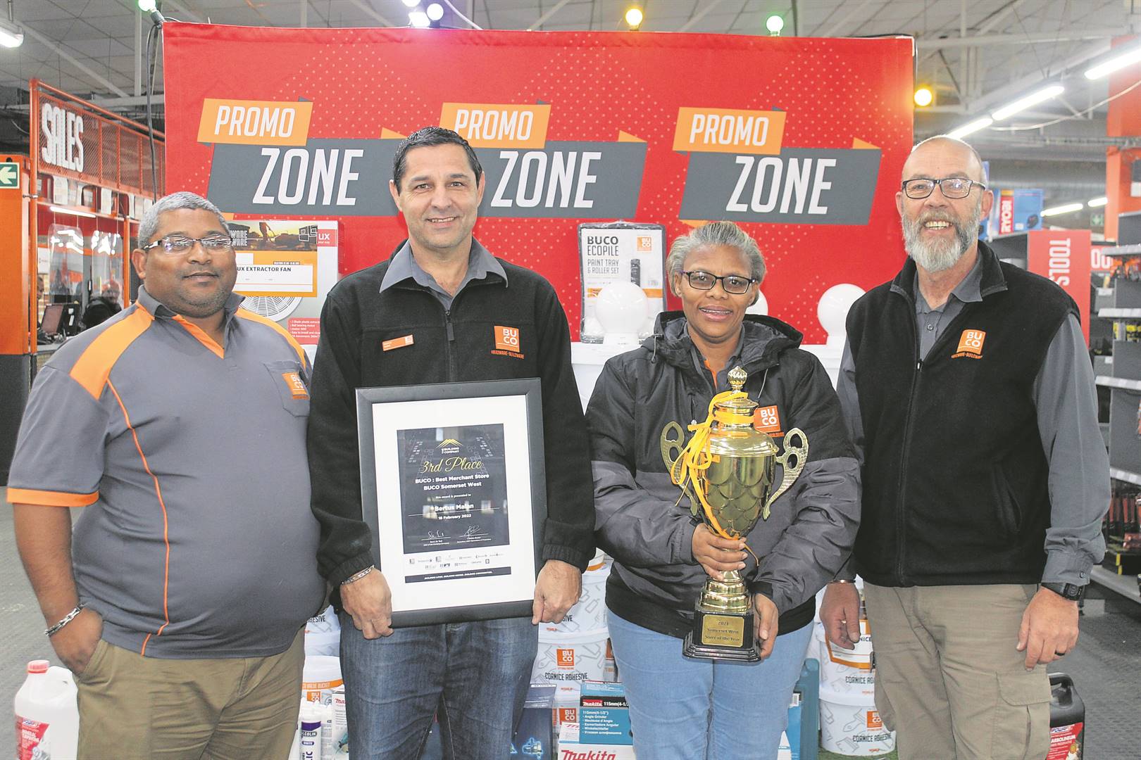 BUCO Somerset-Wes is vroeër vanjaar as 2021 se hardewarewinkel wat die beste in die provinsie presteer het, en derde beste in die land, aangewys. Dié plaaslike onderneming is in Februarie by die nasionale jaarlikse konferensie van The Building Company – wat byna 100 BUCO-winkels in Suid-Afrika en Namibië besit – met hierdie toekenning vereer. “Ek is baie trots op my personeel en dankbaar vir hul puik klantediens wat ons gehelp het om hierdie sukses te behaal,” het Bertus Malan, winkelbestuurder, gesê. “Ons is trots op hierdie prestasie, maar besef ook dat ons moet aanhou hard werk en klantgerig bly.” Malan het verder gesê BUCO Somerset-Wes se trots is steeds om klante eerste te stel, want “sonder die gewaardeerde ondersteuning het ons gemeenskap nie ’n suksesvolle onderneming nie.” Hy het hul sukses toegeskryf aan goeie, hardwerkende en pligsgetroue personeel wat die visie deel om BUCO Somerset-Wes die beste hardeware- en boumateriaalwinkel in die land te maak. Die span staan slaggereed om besoekers met puik klantediens te verwelkom. Die bestuurspanlede wat spog met die sertifikaat en beker is Recardo Christians (werfbestuurder), Maullen Howse (assistentbestuurder), Margaret Fielies (aankope-bestuurder) en Malan.