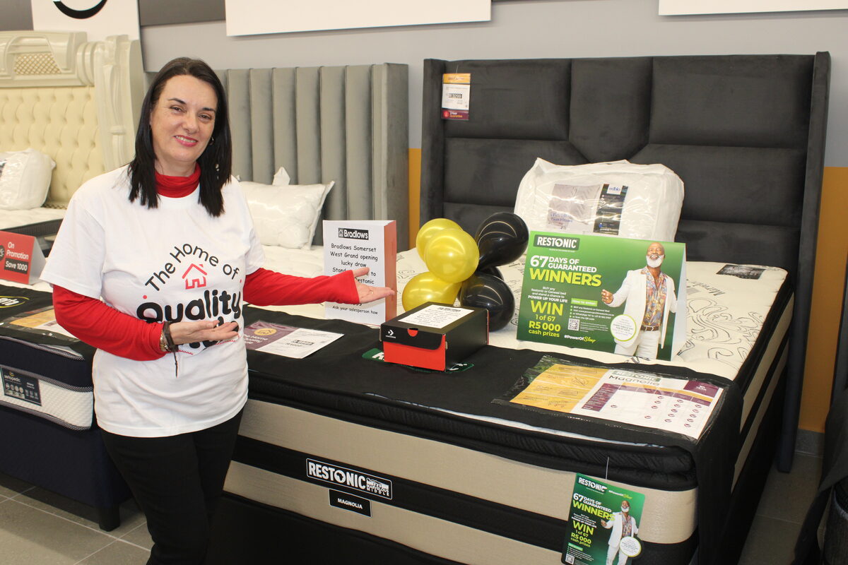 Bradlows Somerset West branch manager, Michelle Rodrigues, shows of the winning prize in a competition whereby every credit deal gets an entry to a lucky draw to win a Restonic Magnolia Queen size base set worth R7999. The competition is valid until 3 August.