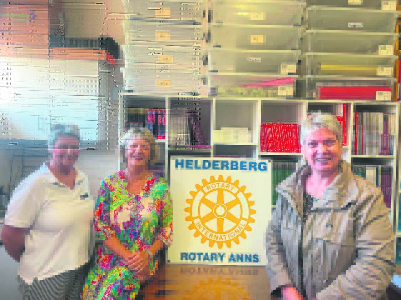 The Helderberg Rotary Anns donated the schoolbooks for the high-school learners at Ons Plek Helpende Hand, which included an amount of R8 045 to assist 10 children with the necessary schoolbooks they need. Pictured at the handover were Gayl Boon and Mieke MacDonald of Helderberg Rotary Anns, with Miemie Calitz from the Book Corner at Strand High School.