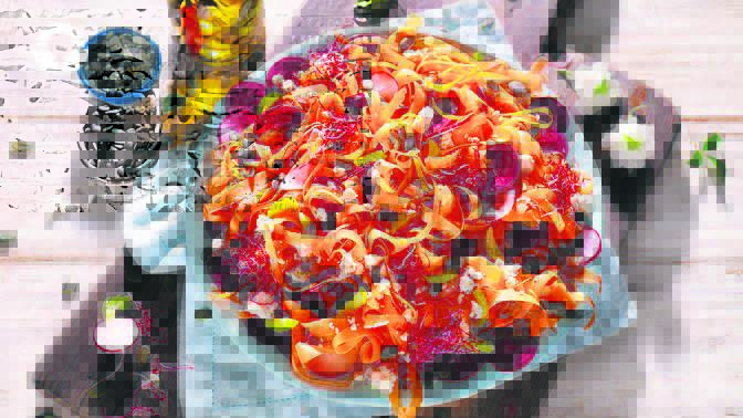 Arrange the carrot ribbons on a platter and dot the beetroot and radish shavings in between.