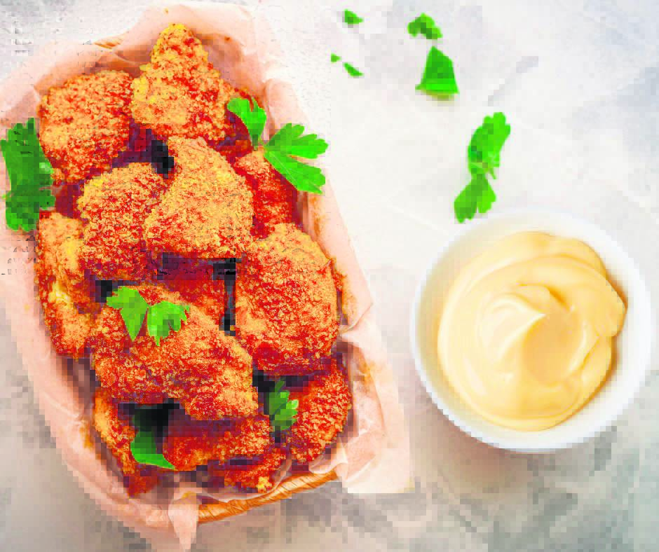 4. Place the coated chicken nuggets on a baking tray lined with parchment paper. Drizzle with canola oil.