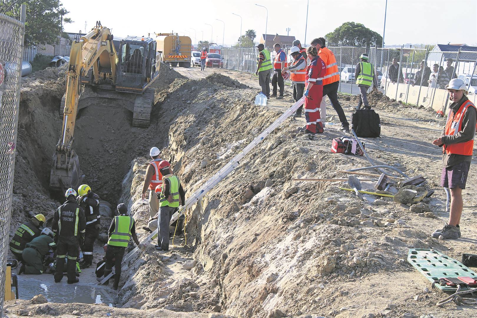 On Tuesday 17 September, a trench collapsed while a City of Cape Town contractor was installing a rising sewer main along Broadway Boulevard in Gordon’s Bay, trapping one worker and injuring others.