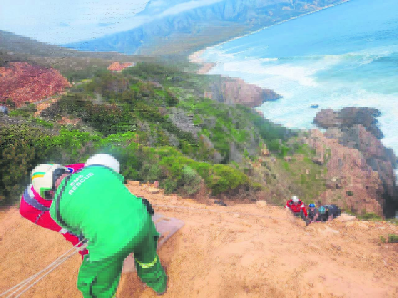 A complex emergency rescue was carried out at Dappat Se Gat, near Kogel Bay along Clarence Drive (R44) last Friday afternoon (27 September). The operation involved rescuing a man who had fallen down the rocks and could be reached only by harness. He was lifted to safety and found to have sustained only minor bruises. It is believed the man pulled over to the side of the road and walked to the edge to admire the view when he slipped and fell. He was treated on the scene.