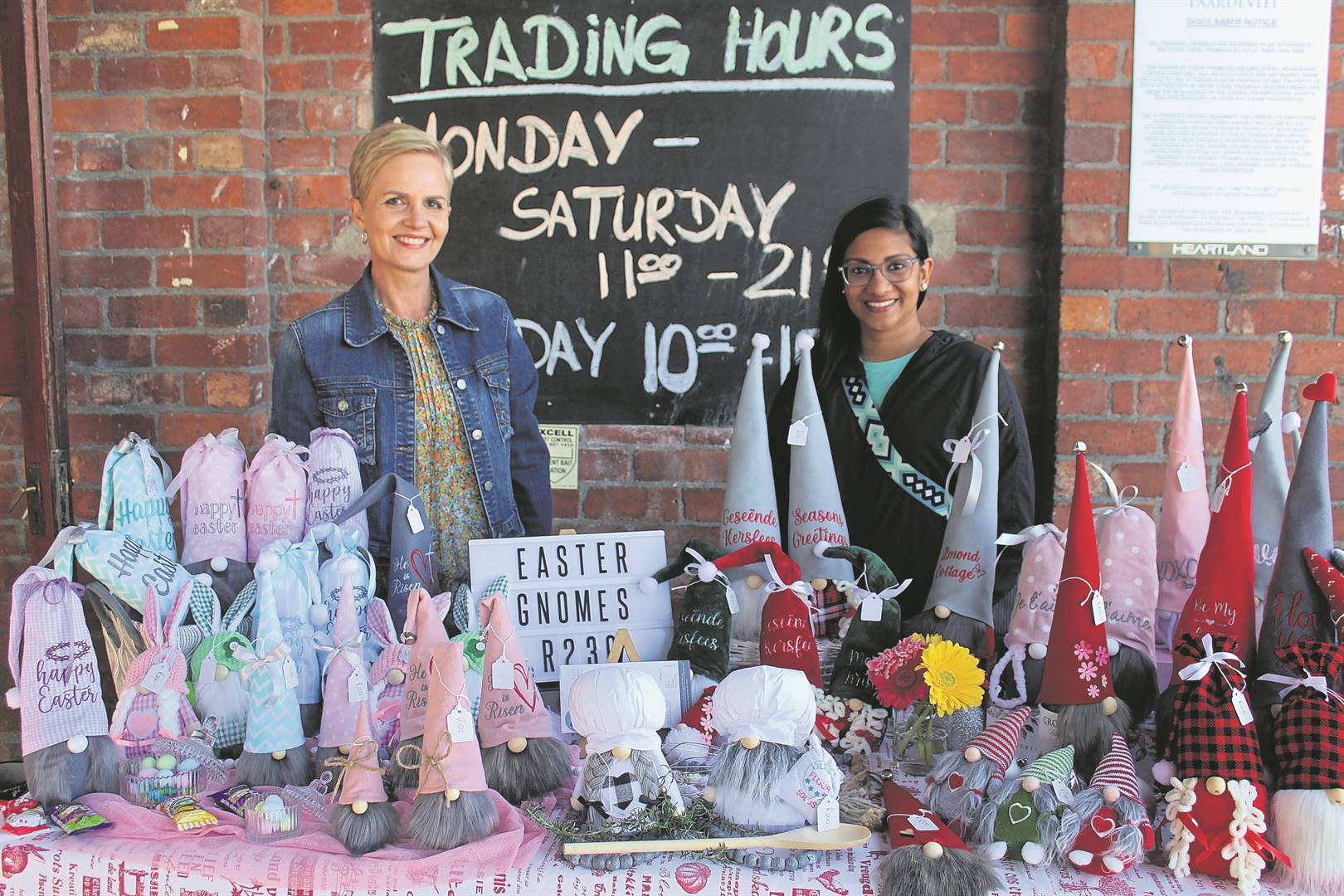 Somerset West entrepreneurs Amanda du Plessis and Jerusha Chetty with their latest offering of Easter gnomes which were on display at the Triggerfish Farmers Market on Sunday 2 April. Photo: Jamey Gordon