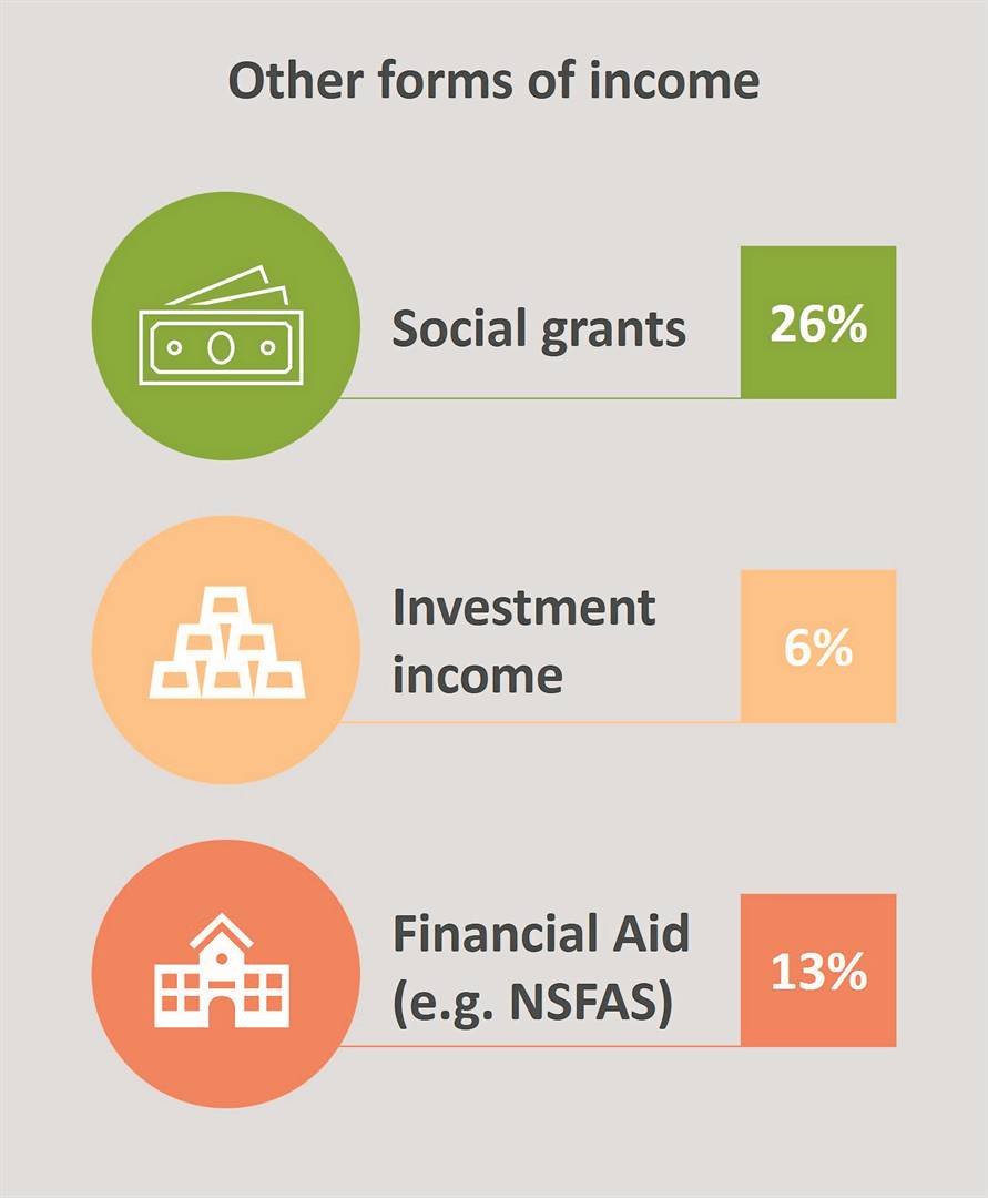 They list taking on short-term contracts or freelancing, running their own businesses, working at what they describe as side hustles, renting rooms or homes, earning investment income and doing odd jobs. Just over a quarter (26%) said they relied on social grants and 13% listed the National Students Financial Aid Scheme (NSFAS) as an income source.