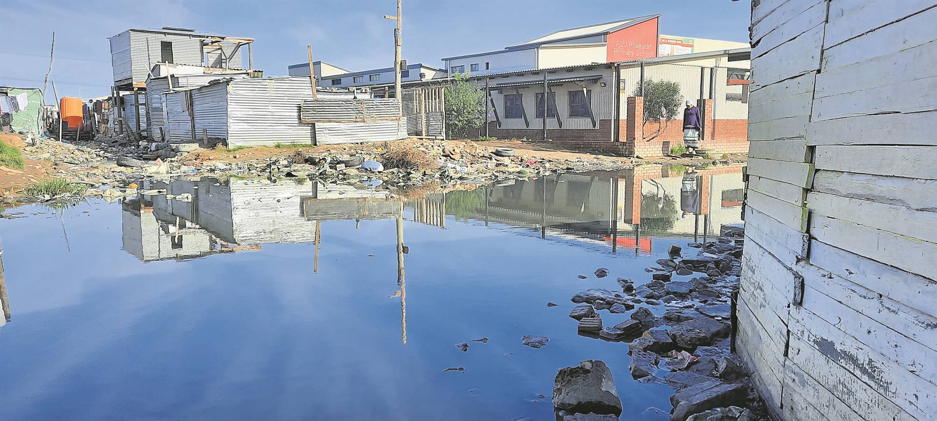 Mhlaba Mhlaba, who owns the local Ntsika spaza shop around the corner from the school, claimed the overflowing retention dam is resulting in him losing business.
