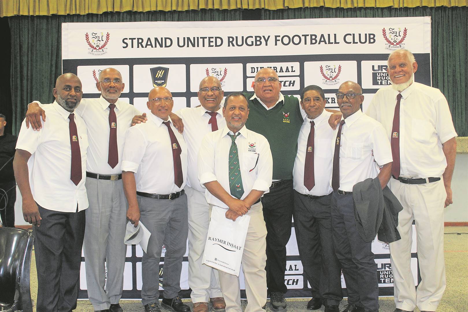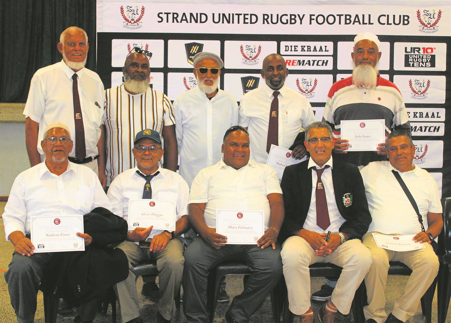 Willie Gordon, Chris Simons, Faeez Davids, Mervyn Swartland, Shamiel Ismail (Strand United chairperson), Ismail Baderoen; (front) Sedick Crombie.