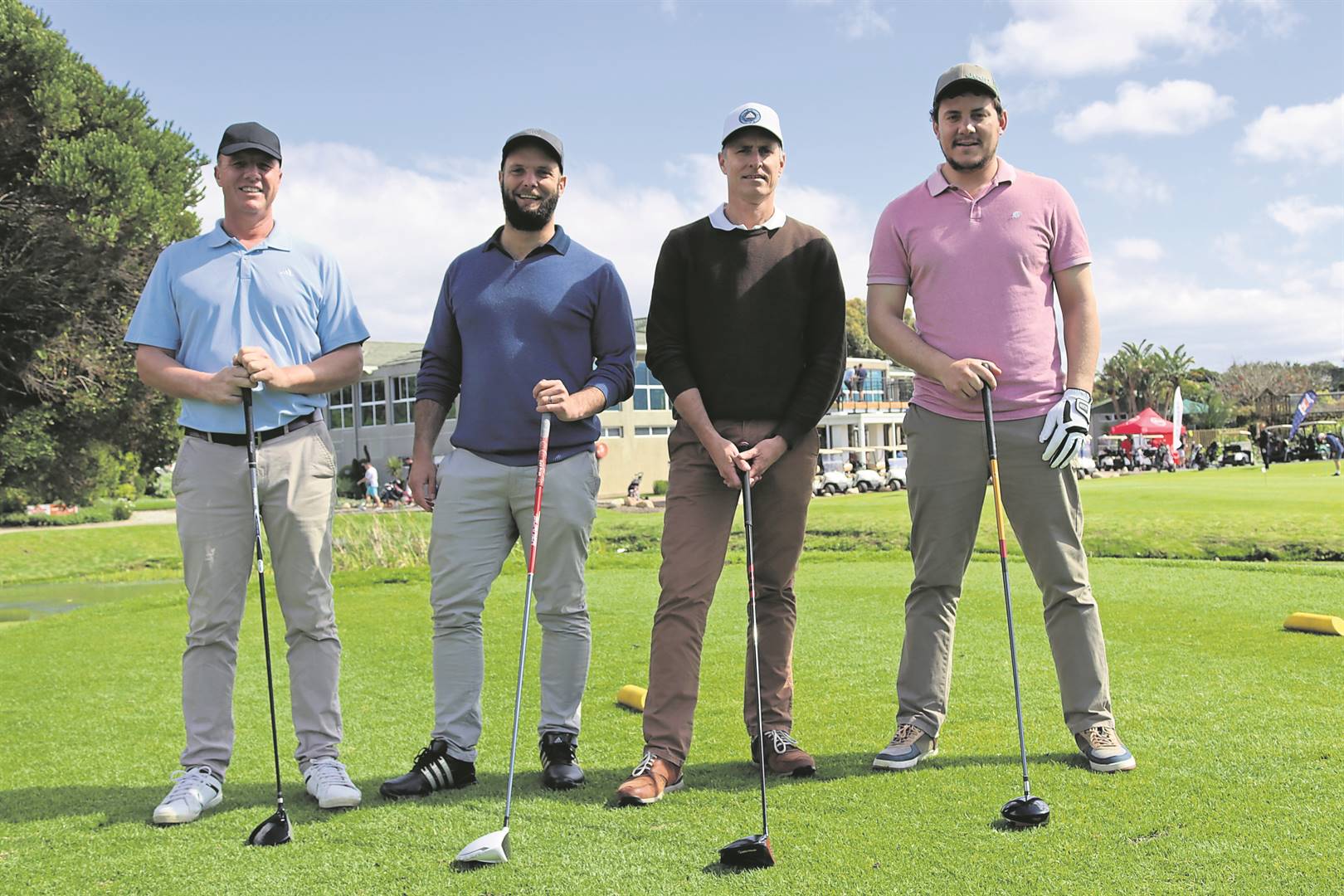 Die vierbal was deel van ’n groep spelers wat eerste afgeslaan het op die Hoërskool Strand se gholfdag. Van links is Davy van der Westhuizen, Cobus Tait, Shaun van Vuuren en Carl Bodenstein.