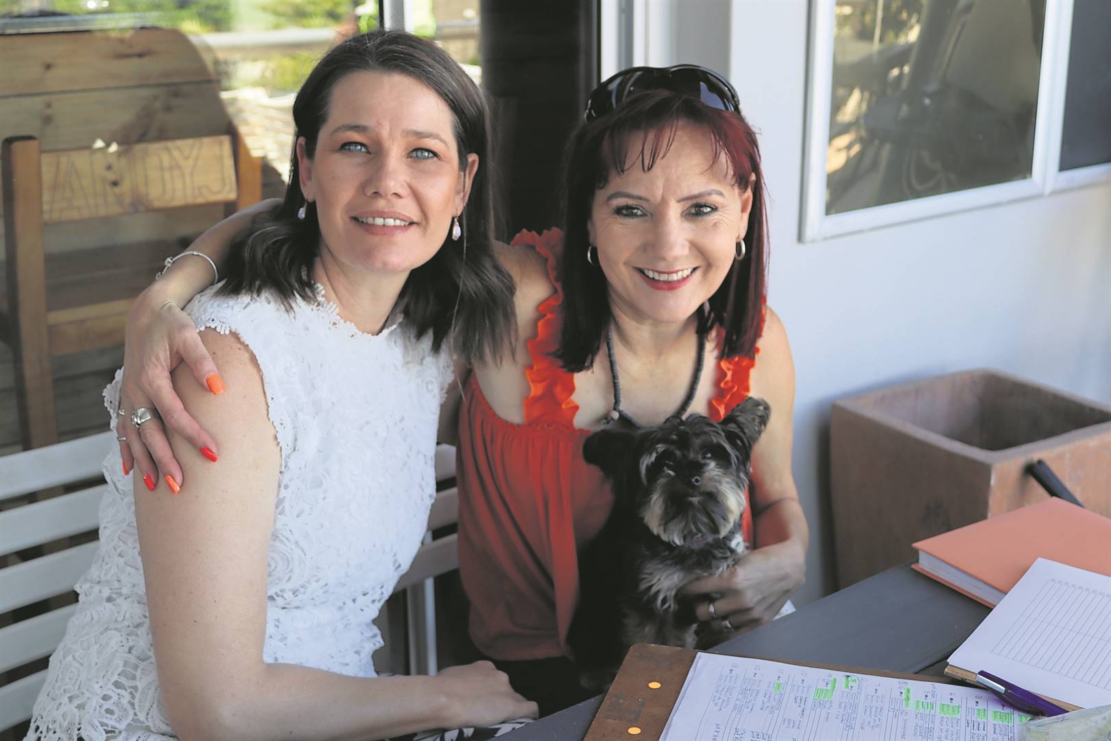 Yolanie Jordaan en die organiseerder van die gholfdag, Launa Cronje, met ’n vierpotige vriend wat ook deel van die pret was.