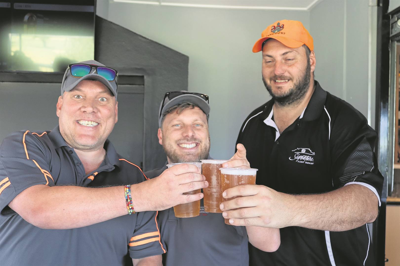 Laat hy val waar hy wil! TVZ Financial Planning se Antoni van Zyl, Marco van Zyl en Shawn Muller het ’n koue een geniet nadat hulle die gholfbaan aangedurf het.